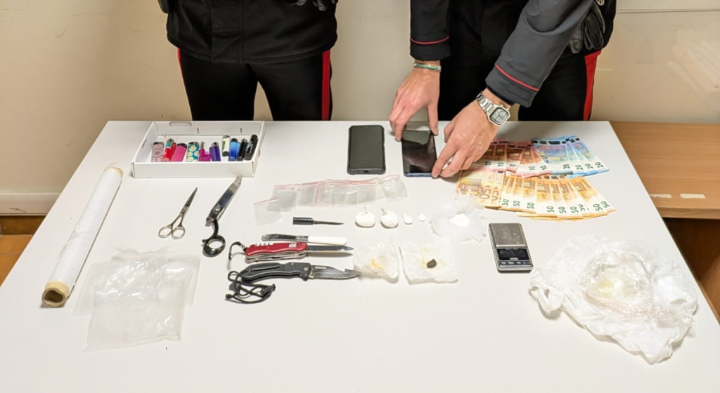 La successiva perquisizione personale e domiciliare ha consentito di rinvenire 24 grammi di cocaina, già suddivisi in dosi, 770 euro in contanti, ritenuti provento dell’attività di spaccio, oltre a materiale vario per il confezionamento della droga.